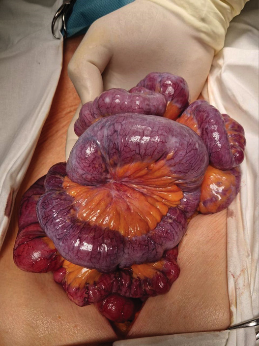 Рис. 1. Петли тонкой кишки после лапаротомии, выраженные ишемические изменения стенки тонкой кишки на протяжении 100 см