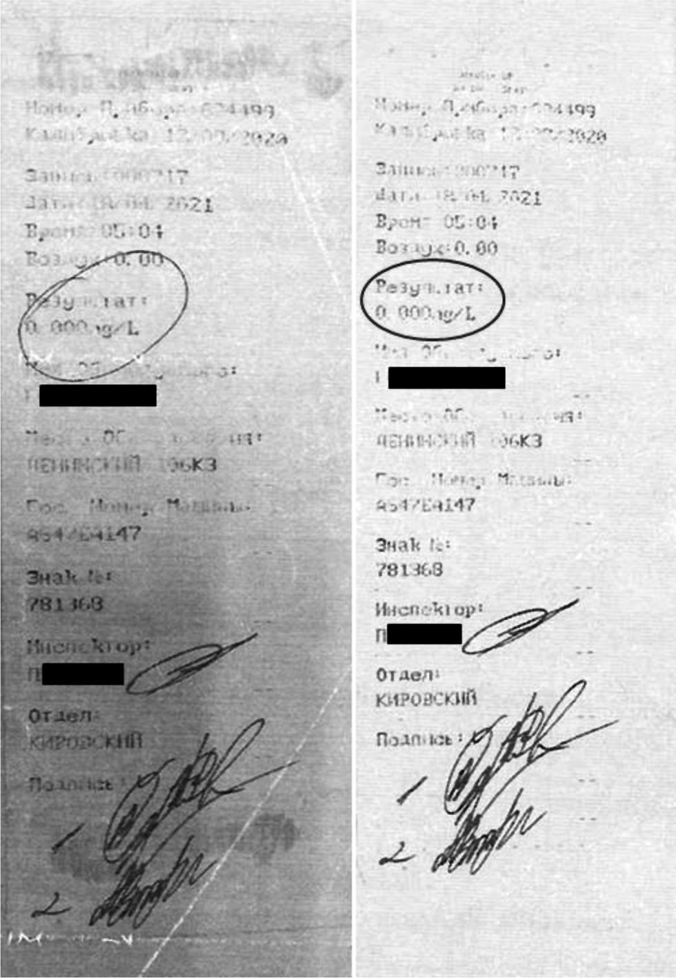 Furthermore, the report stated the following: “… was performed at 05:04 using Alcotector PRO 100 combi® (Shenzhen Well Electric Co., Ltd., China), serial number 634499, last calibrated on September 12, 2020, permissible absolute error limit ±0.048 mg/L. Instrument reading 0.000 mg/L. Testing result: intoxication not detected…” A forensic toxicology expert was subsequently provided access to all materials, including the original output listing, which indicated the instrument reading of 0.000 mg/L at 05:04 on April 18, 2021 (Fig. 1).