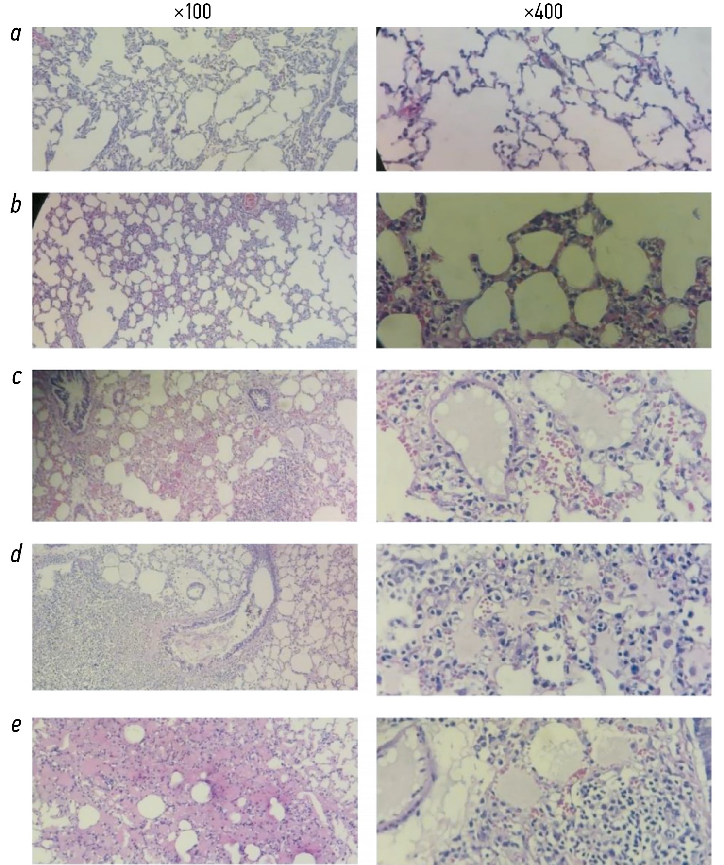 Fig. 1. Histopathological examination of rat lungs revealed progressive damage: a — in P0 (control group), the alveolar structures appeared to be normal; b — in P1 (30 min), mild septal thickening and mild edema were observed; c — P2 (60 min) showed moderate edema and hemorrhage; d — P3 (90 min) showed severe edema and bronchial fluid accumulation; e — in P4 (120 min) with massive edema, dense inflammation, extensive hemorrhage, and tissue destruction.
