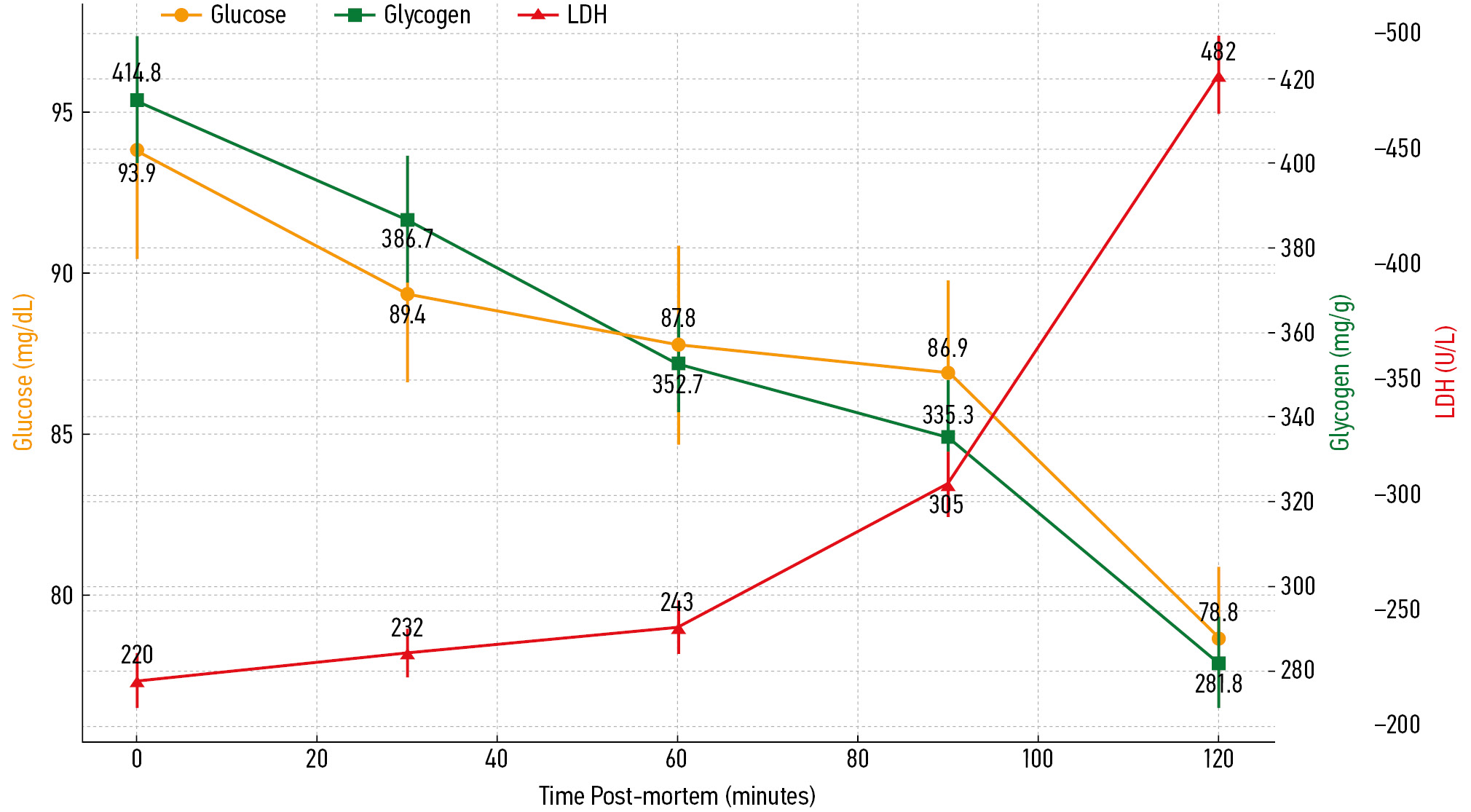 Table 1 and Fig. 2 summarize these biochemical changes, showing the time-dependent depletion of glucose and glycogen, alongside the significant increase in LDH over the observed intervals.