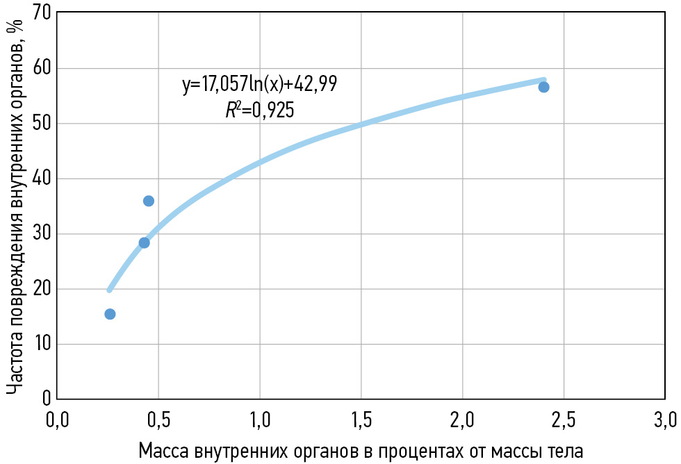 Рис. 1. Соотношение массы внутренних органов и частоты их повреждения при полётах на параплане.
